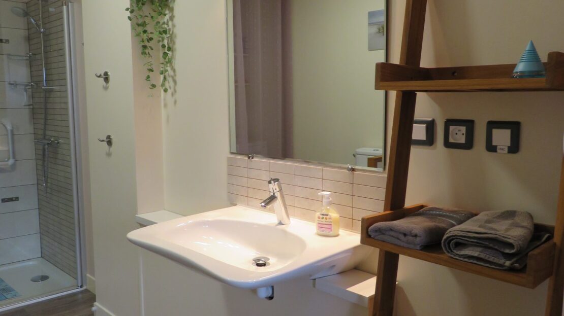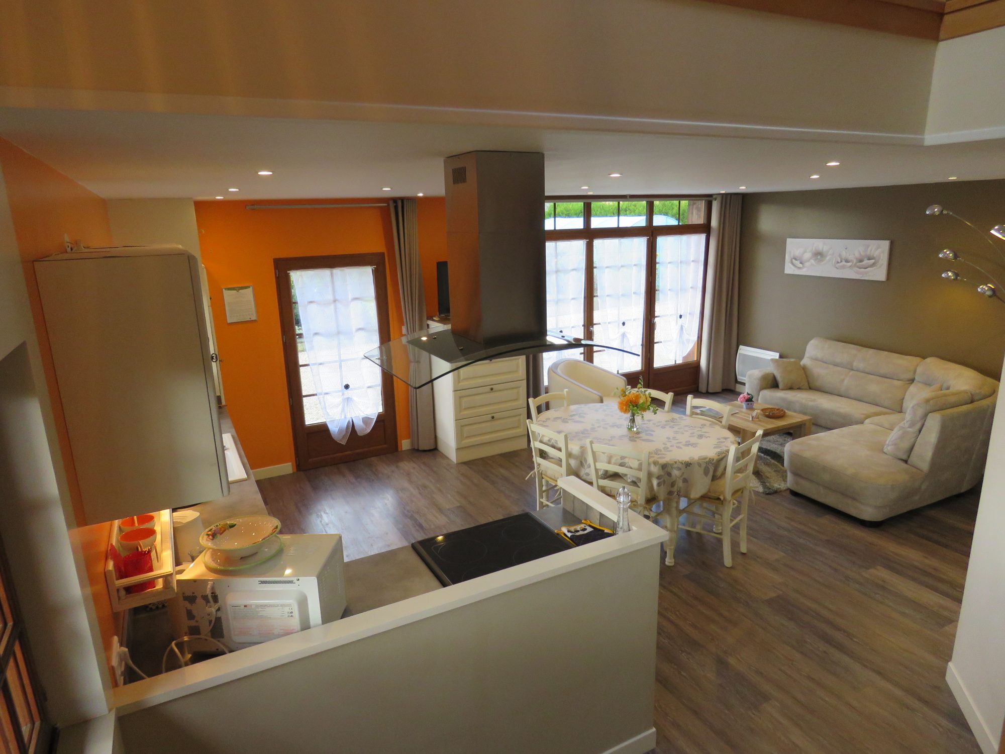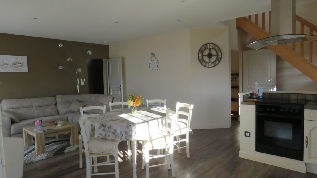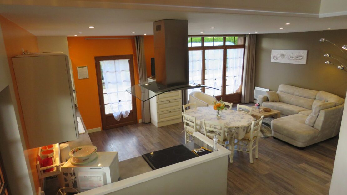 Un grand séjour-salon sur cuisine ouverte équipée, une salle d’eau avec WC, une chambre en rez de chaussée.