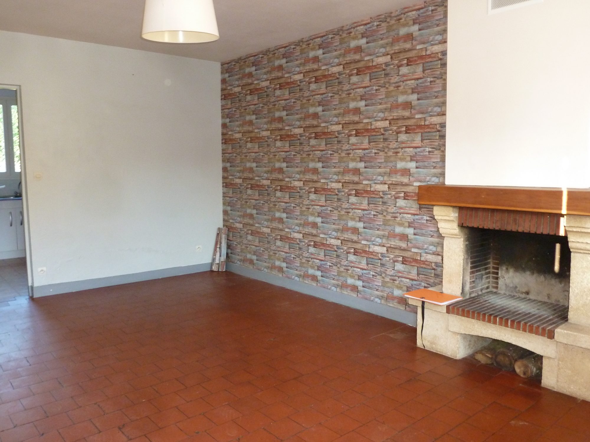 entrée dans séjour avec cheminée ouverte, cuisine, accès à la chaufferie et cave en partie