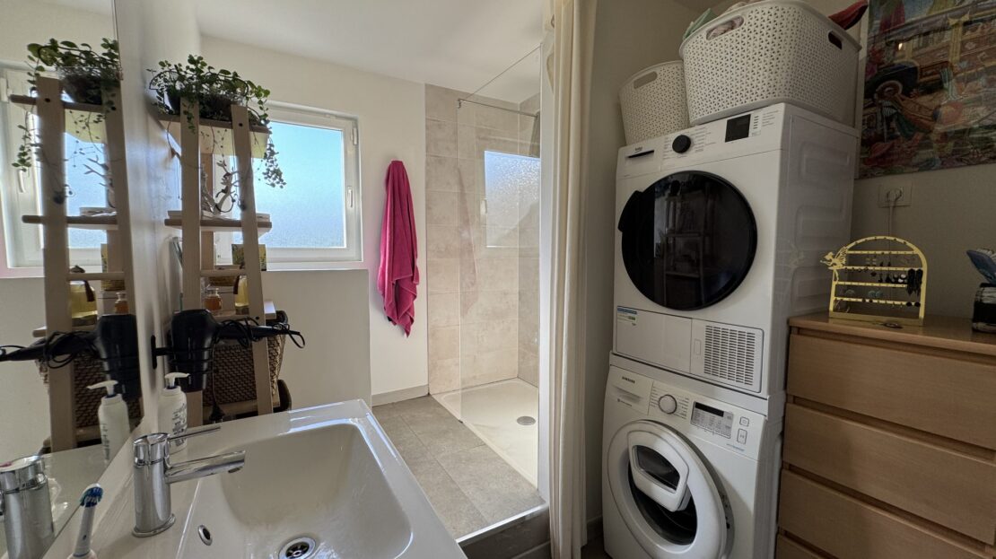 Elle se compose : Une grande entrée, pièce à vivre ouverte et lumineuse, cuisine aménagée avec accès cellier, chambre, pièce dressing, salle d’eau avec wc. Terrasse plein SUD.