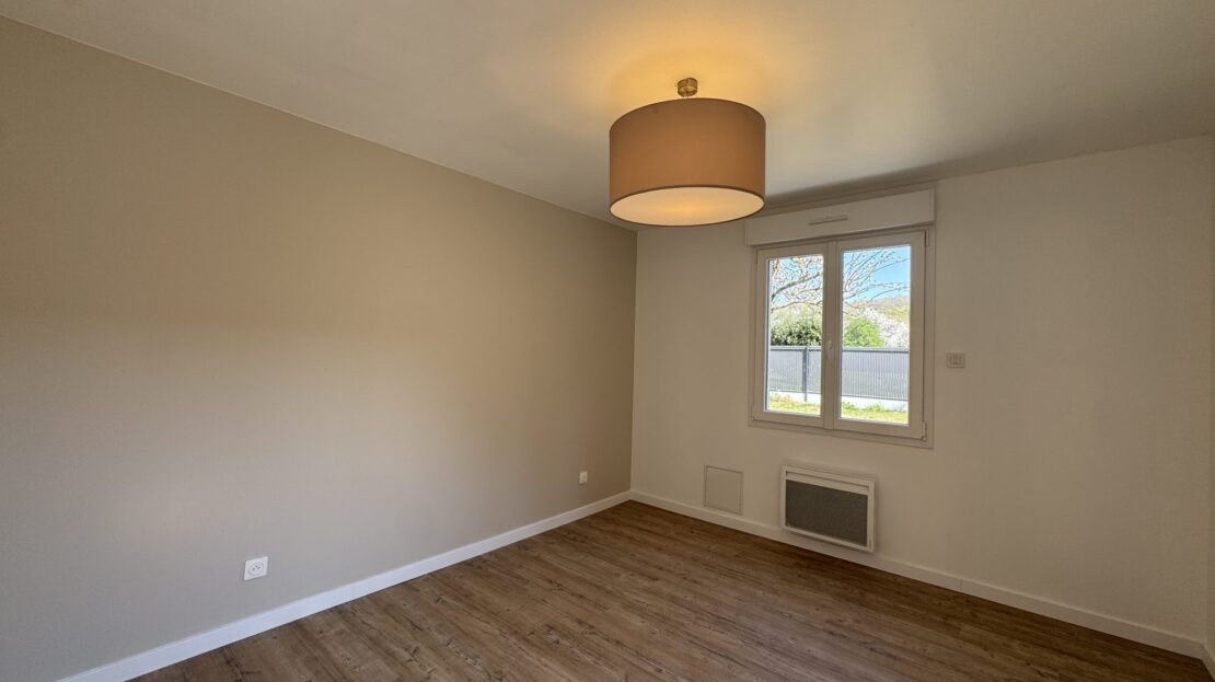Entrée sur pièce de vie (poêle à granules) avec cuisine entièrement aménagée, dégagement, deux chambres, une salle de douches et WC indépendant.