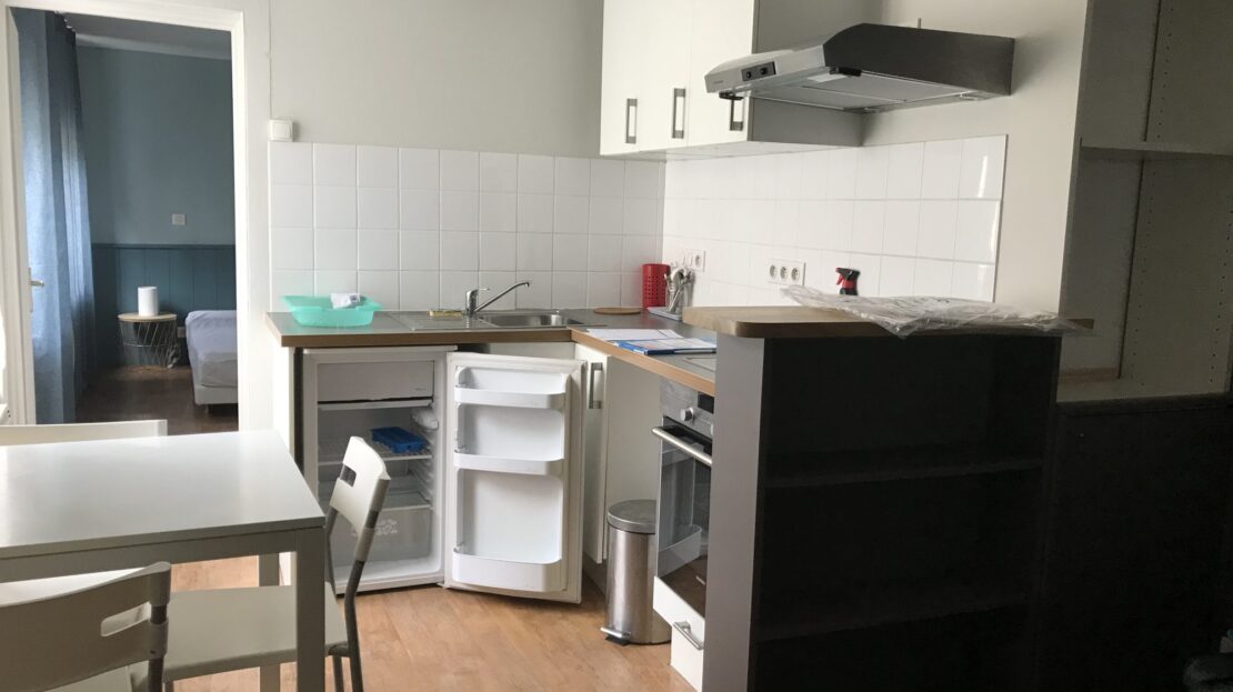 entrée dans séjour cuisine équipée d’une plaque de cuisson, hotte, four, salle de douche avec wc, une chambre.