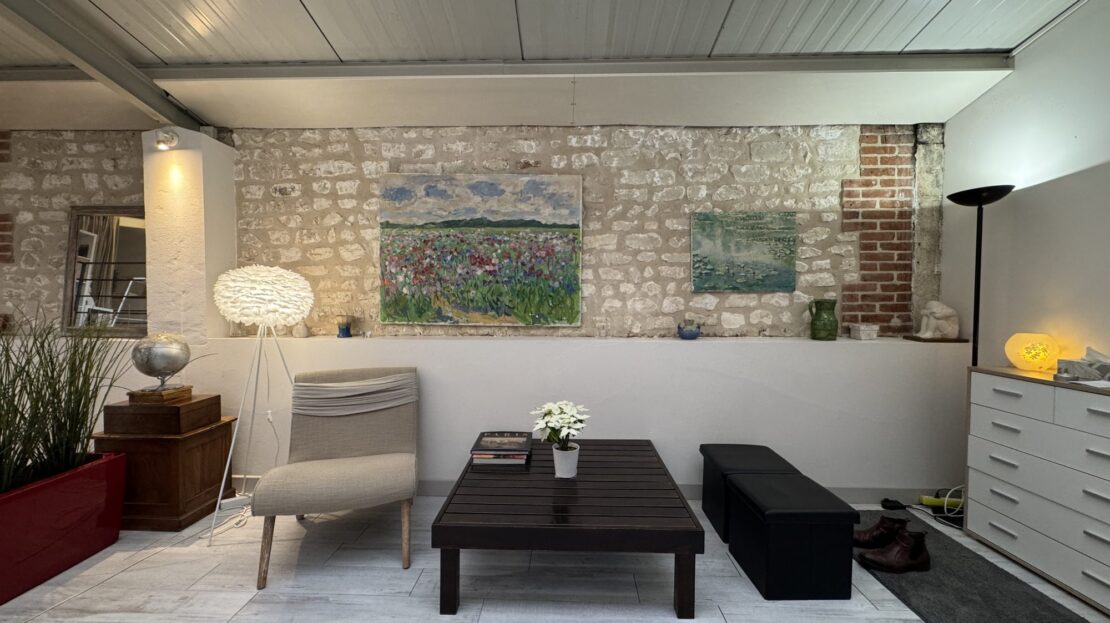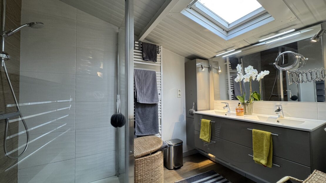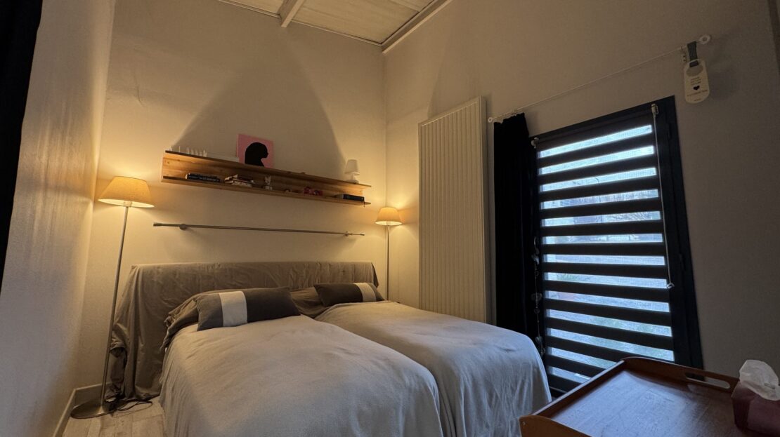 – rez-de-chaussée : entrée, cuisine aménagée et équipée ouverte sur séjour/salon avec poêle à bois, chambre avec salle d’eau.
