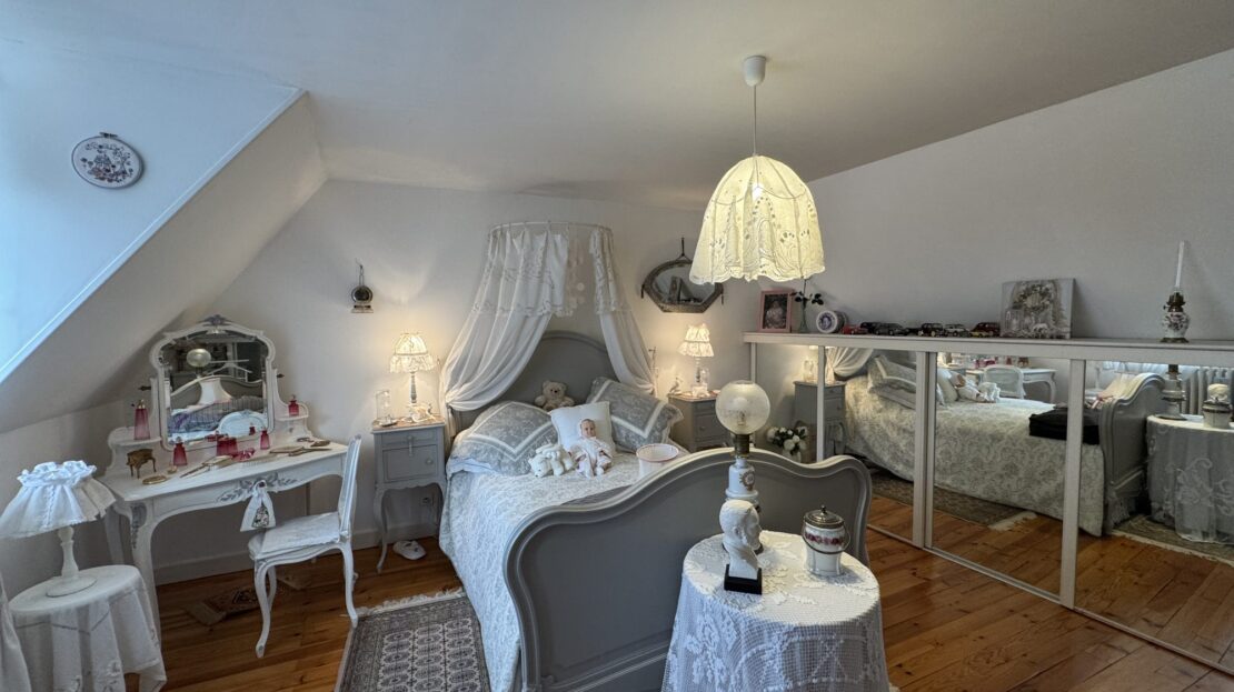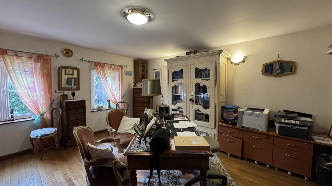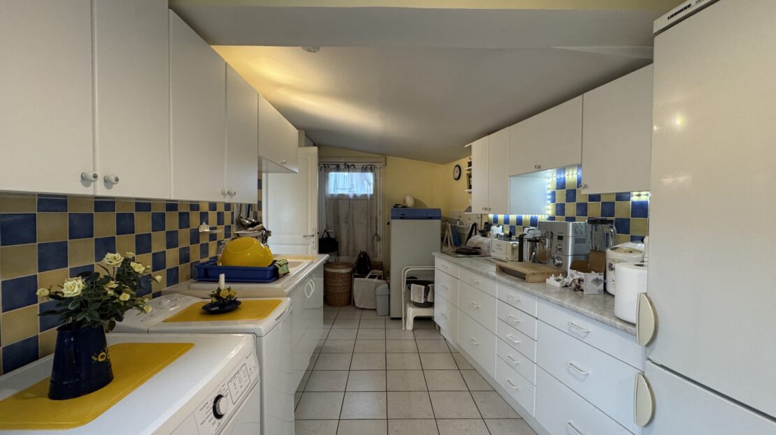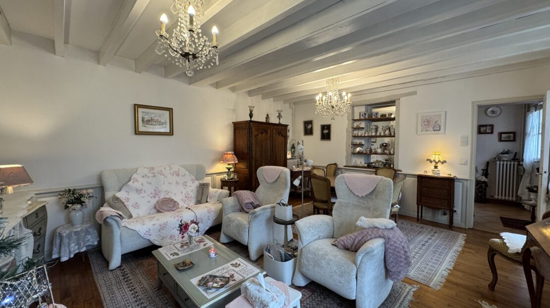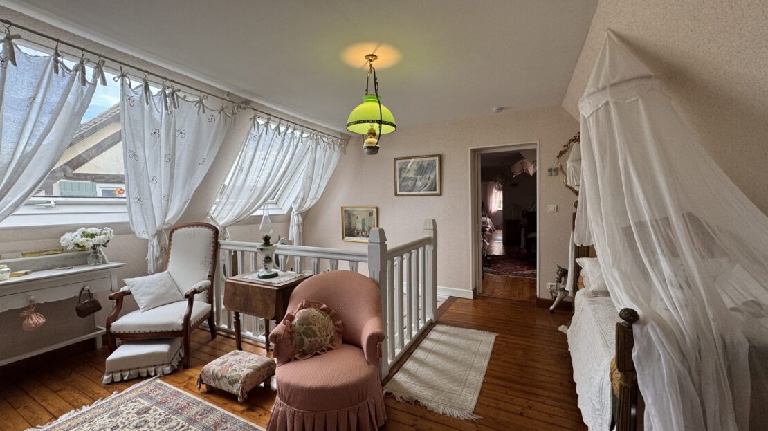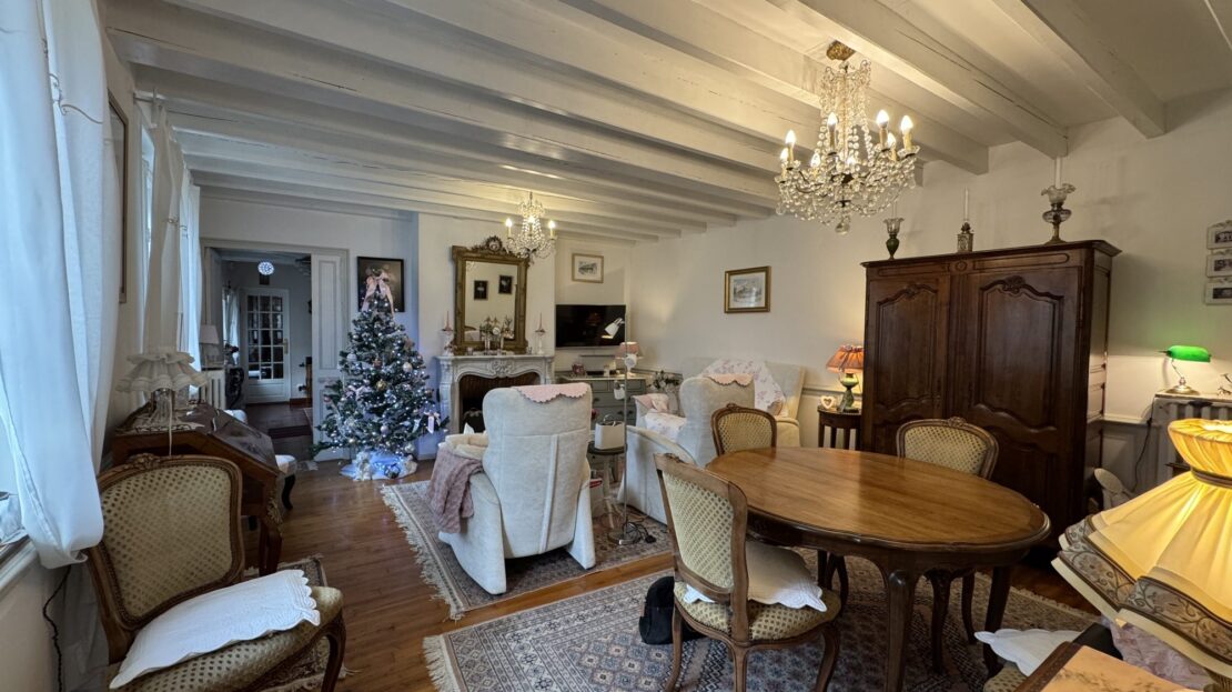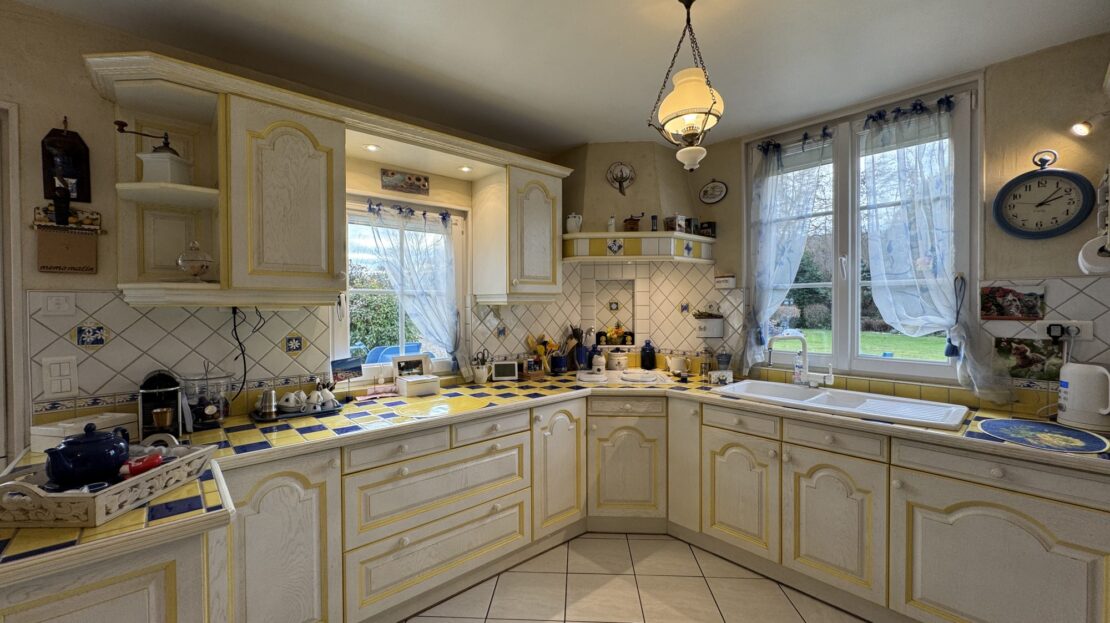 Le séjour de 26 m² avec sa cheminée ouverte est baigné de lumière grâce à ses grandes ouvertures en PVC à double vitrage, créant une atmosphère chaleureuse et accueillante. La cuisine aménagée et équipée est un véritable espace de vie où les chefs en herbe pourront s’épanouir.