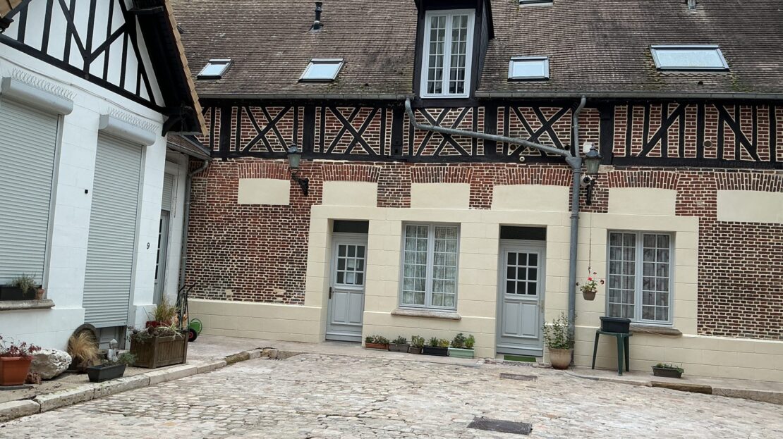 louviers centre, dans très belle résidence pleine de charme avec une cour intérieure, bel appartement de 66.73 m2 situé en rez de chaussée : une belle pièce de vie avec parquet ancien, boiseries et cheminée décorative, cuisine aménagée, deux chambres, salle de douche récente avec wc.