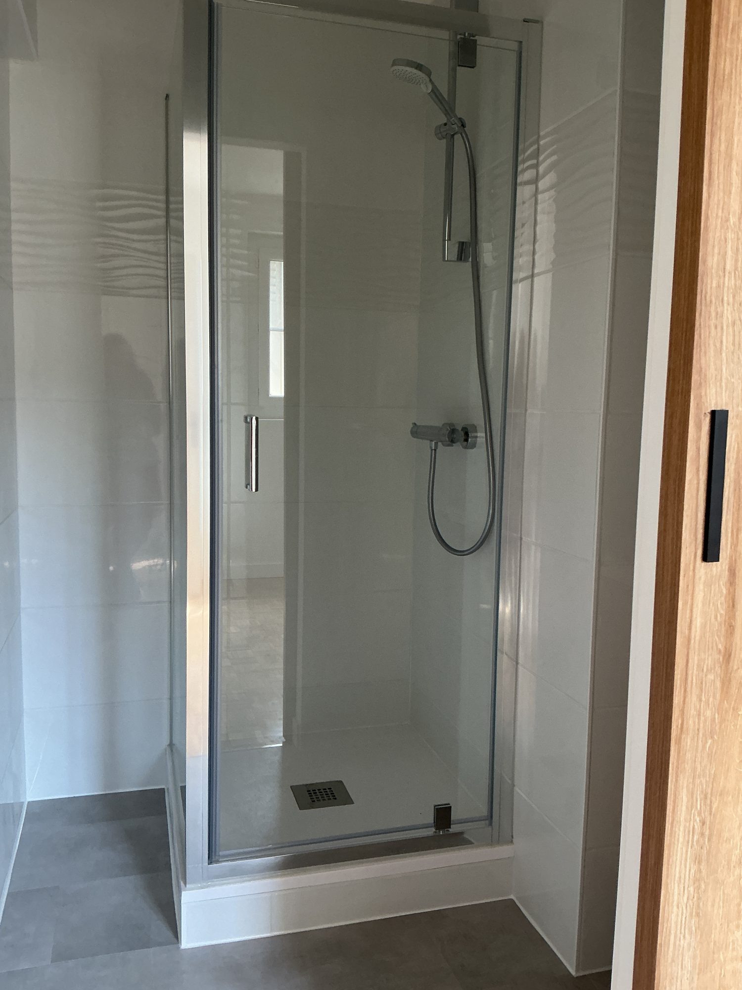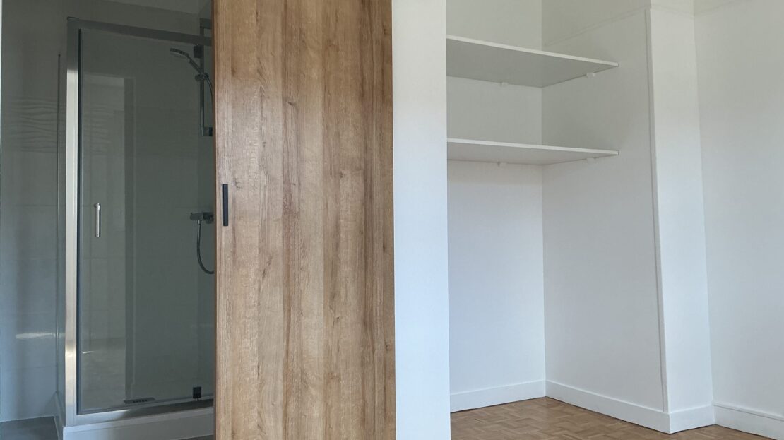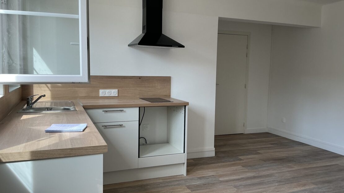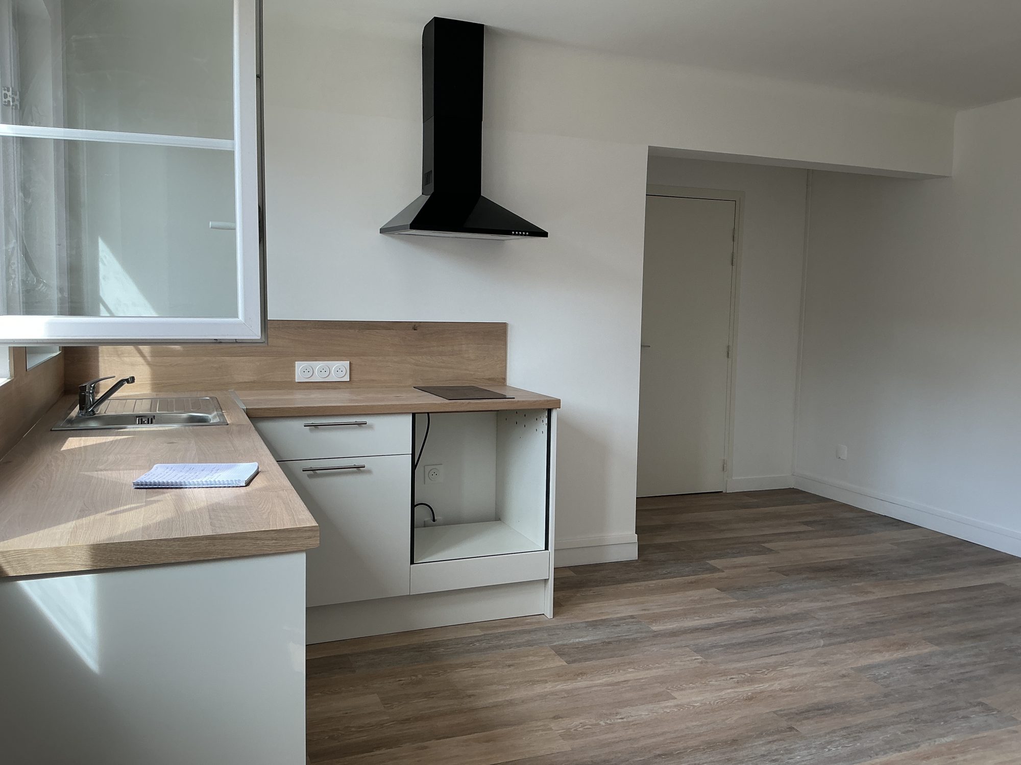 Entrée, wc, cuisine aménagée et équipée d’une plaque de cuisson et hotte aspirante ouverte sur le séjour, une chambre avec rangements, salle de douche et wc.