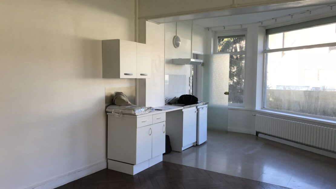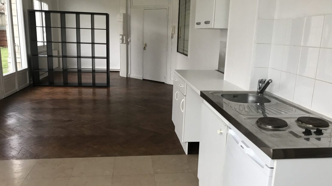 Louviers centre, grand studio de 40 m² en centre ville de LOUVIERS : entrée, cuisine avec plaques de cuisson, hotte et réfrigérateur ouvert sur le grand séjour, salle de douche avec espace pour la machine à laver, wc avec lave-mains.