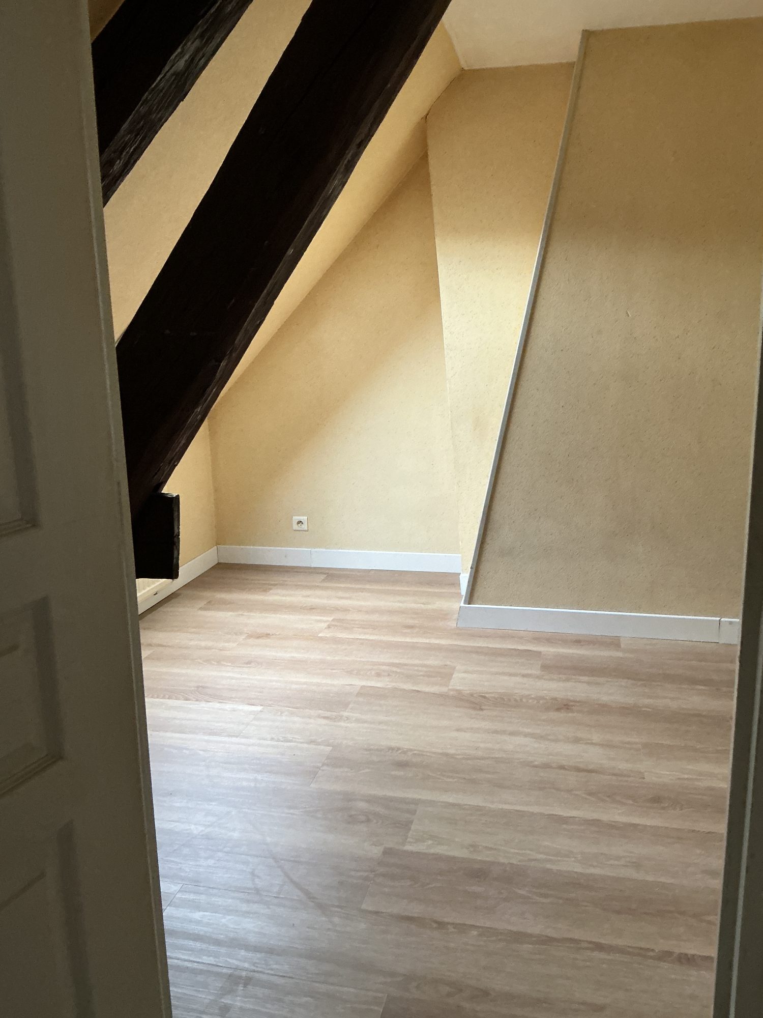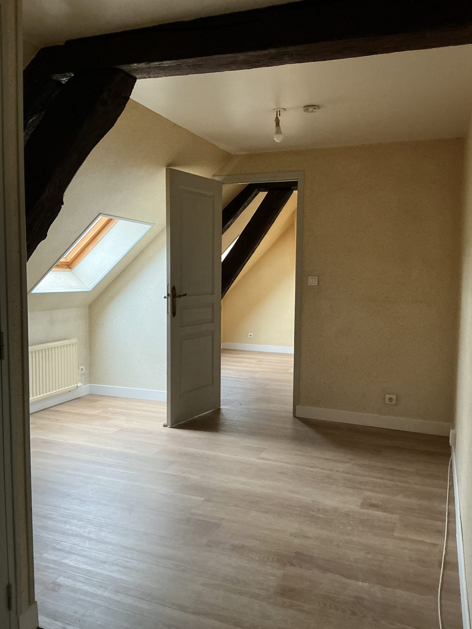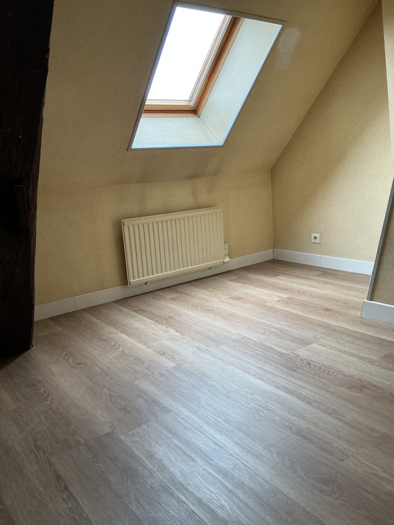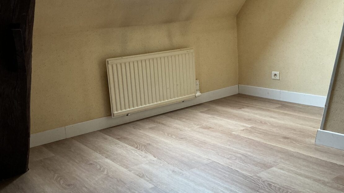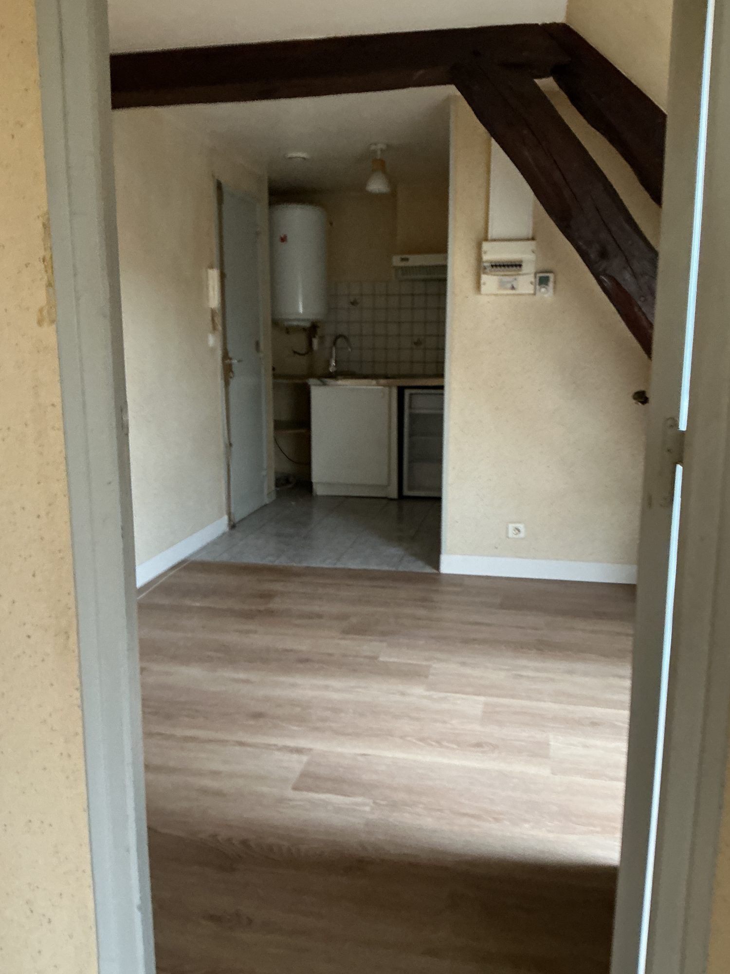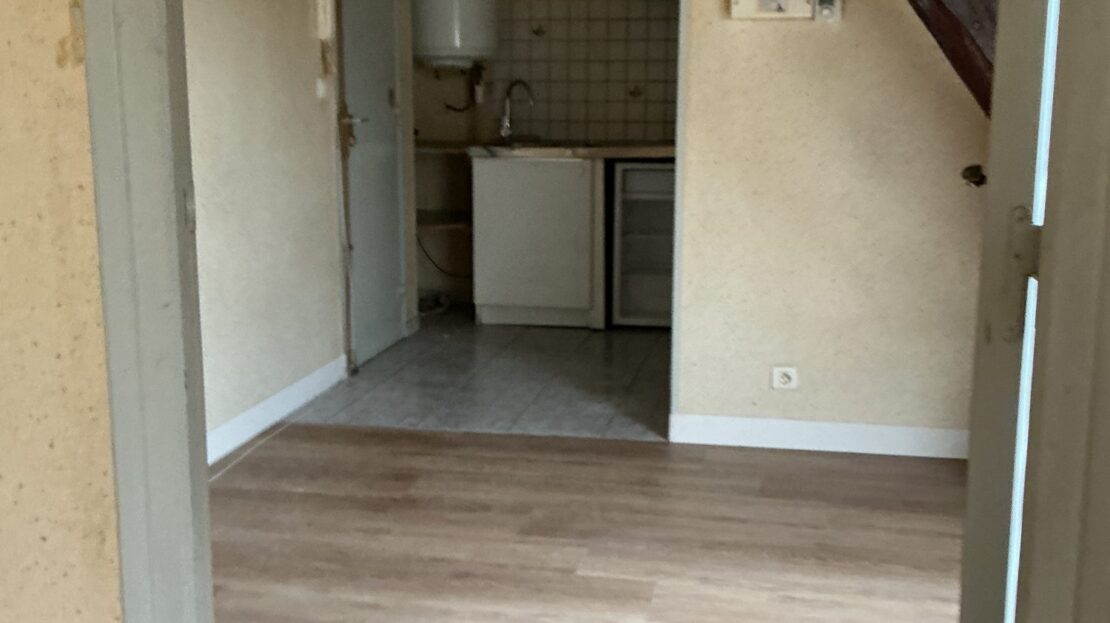 cuisine aménagée d’une plaque de cuisson induction et réfrigérateur et hotte aspirante, séjour parquet neuf, une chambre parquet neuf, salle d’eau avec wc et évacuation pour machine à laver