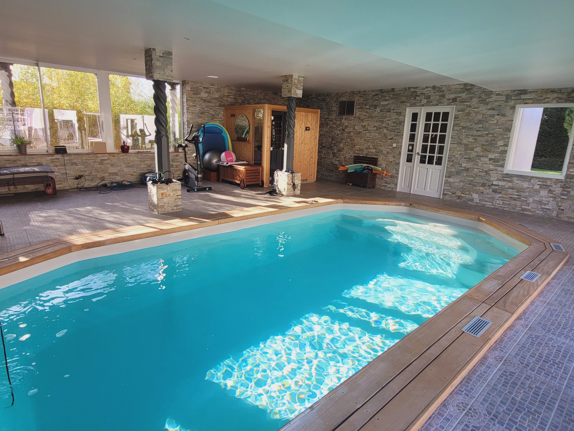 La dépendance, lieu de repos et de convivialité de 135 m²dans laquelle vous trouverez une piscine chauffée, un saune, une salle de douche avecwc et une sale de réeption ou de jeux de 45 m² équipée d’une cheminée.