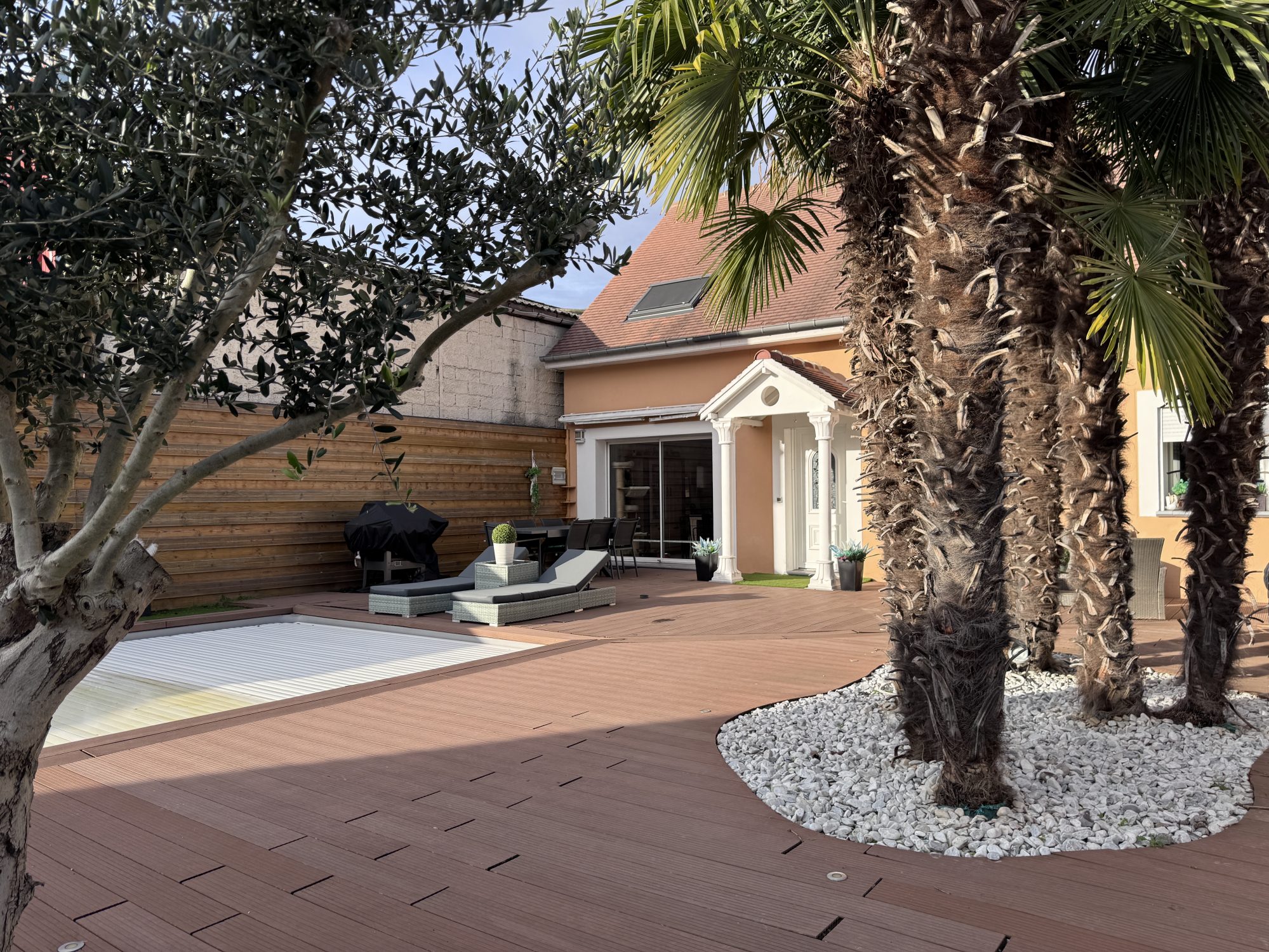 À l’extérieur vous retrouverez une belle terrasse exposée SUD avec piscine chauffée et sécurisée (4m x 8m) ainsi qu’un grand garage (35m²).