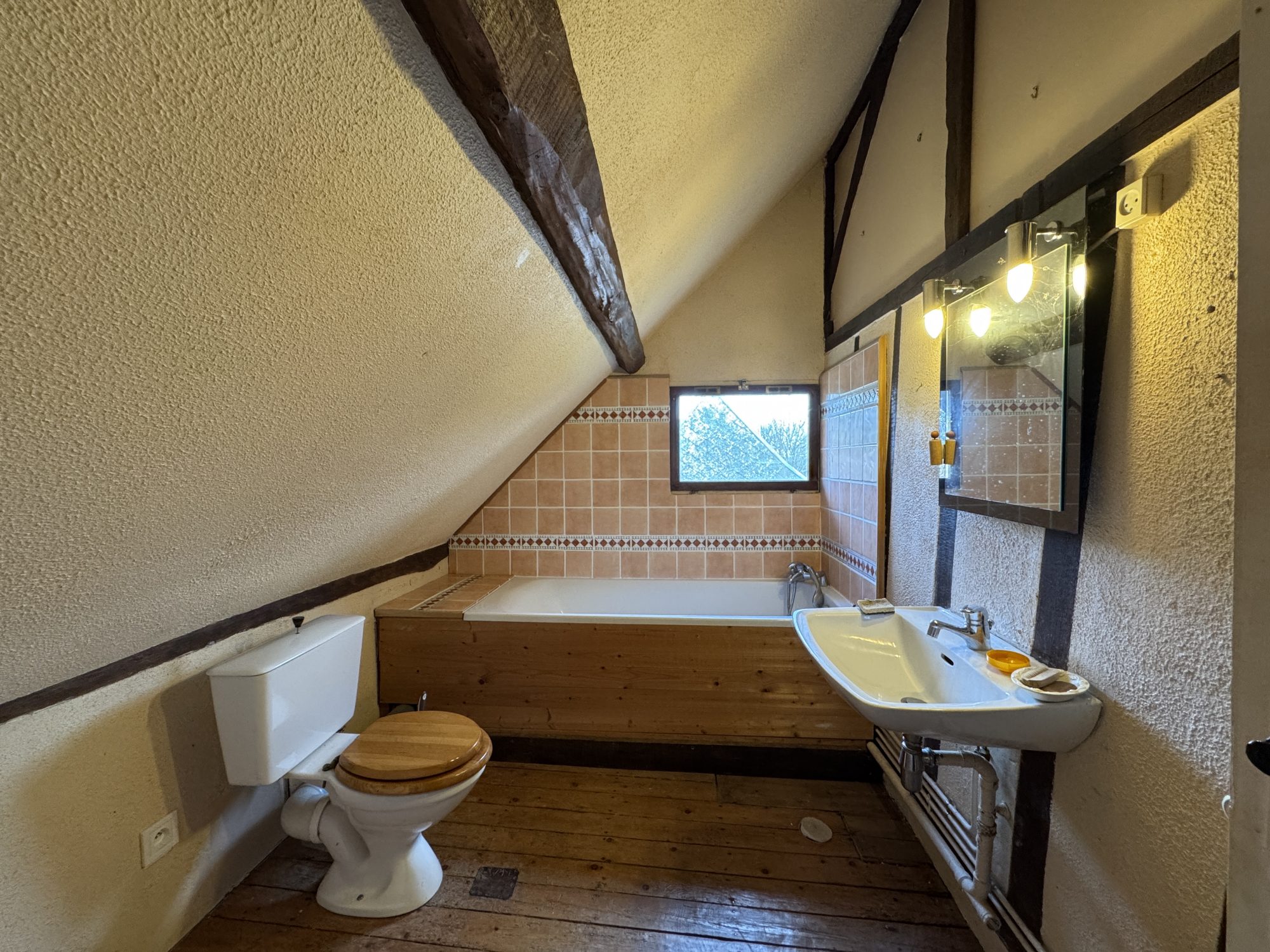 A l’étage : deux chambres, un pallier et une salle de bains avec wc.