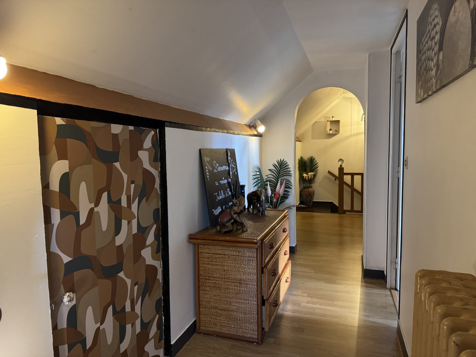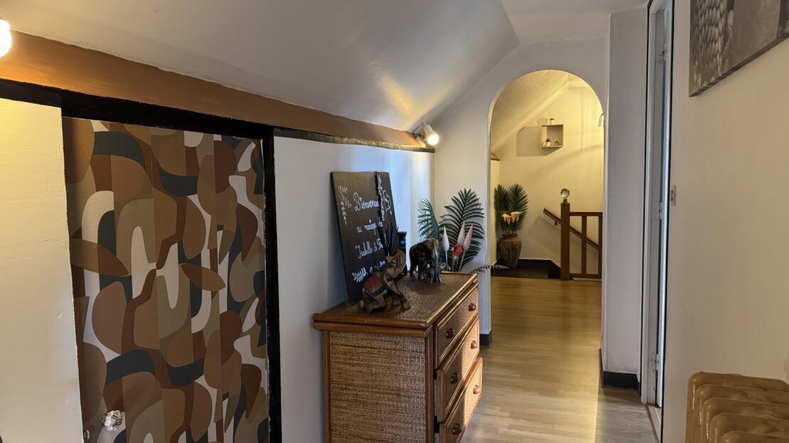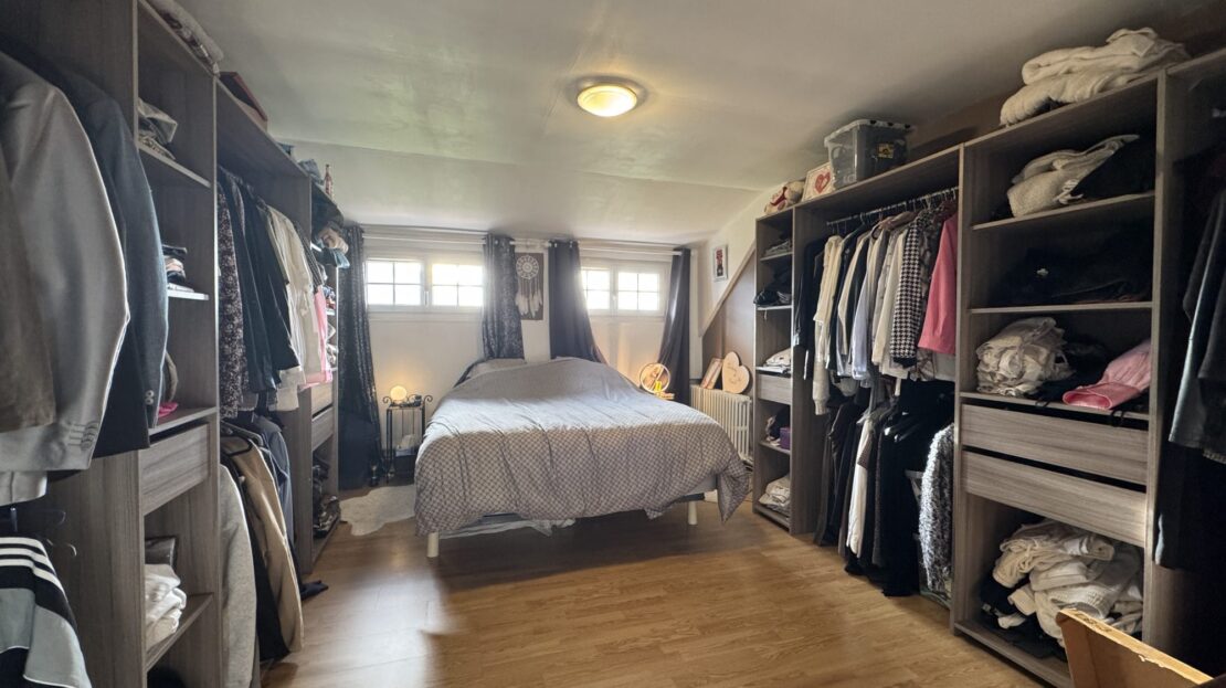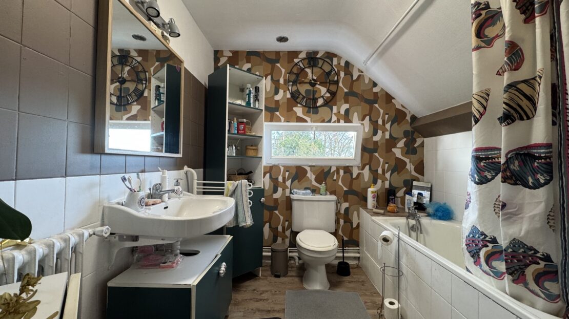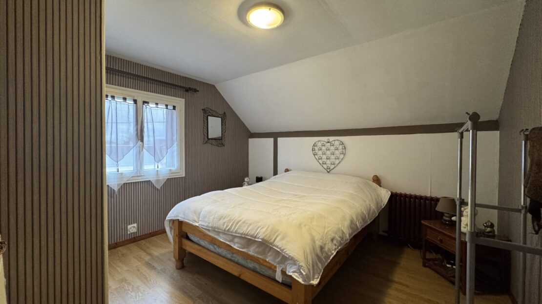 À l’étage, le palier dessert trois chambres et une salle de bains avec WC.