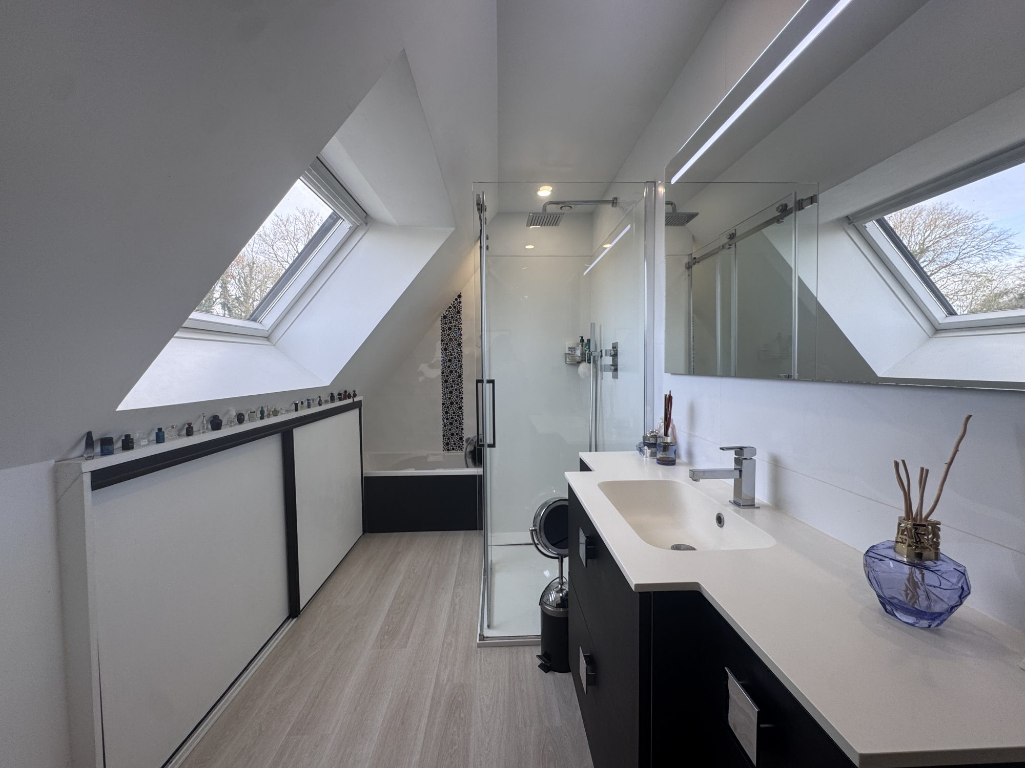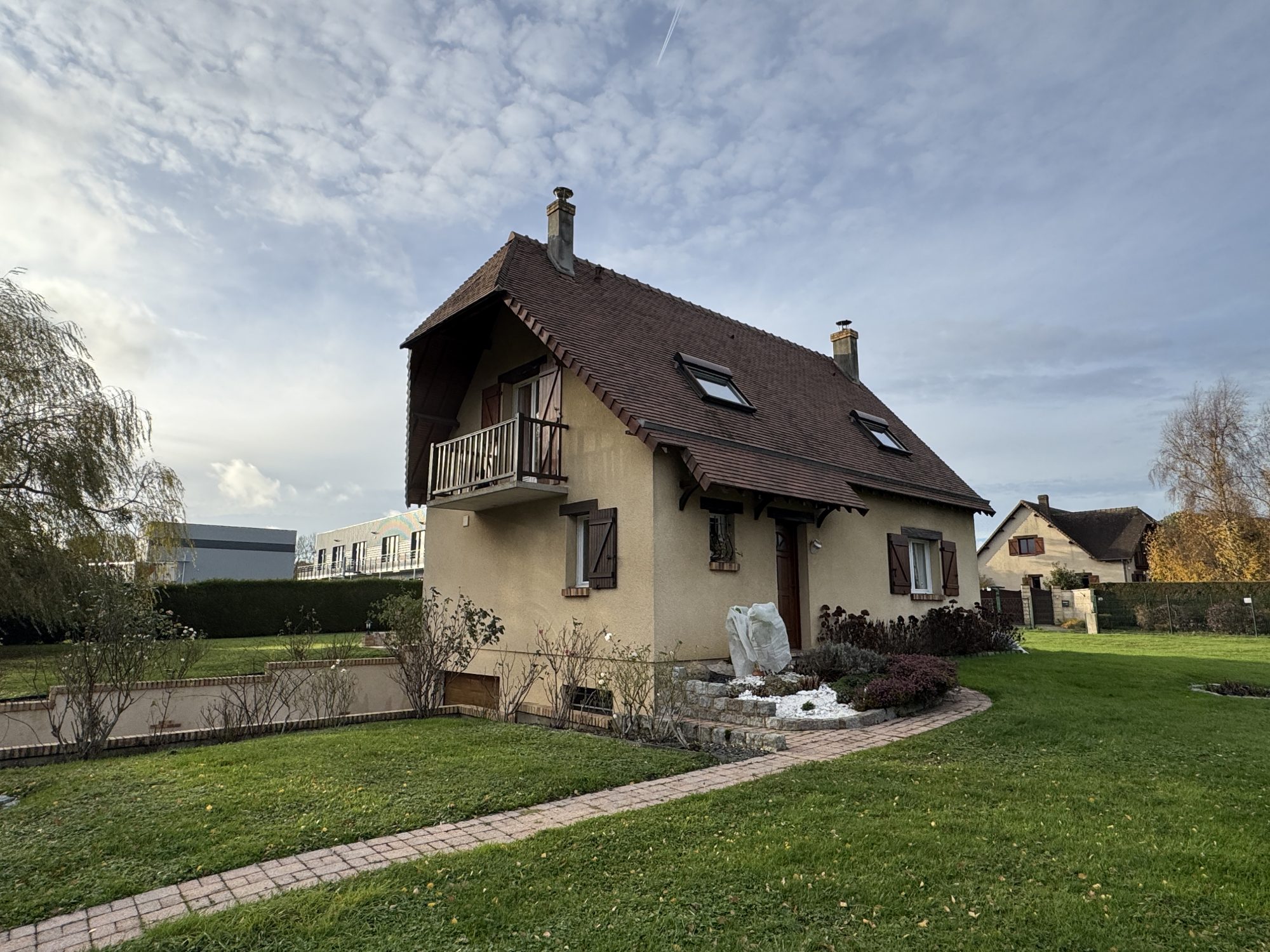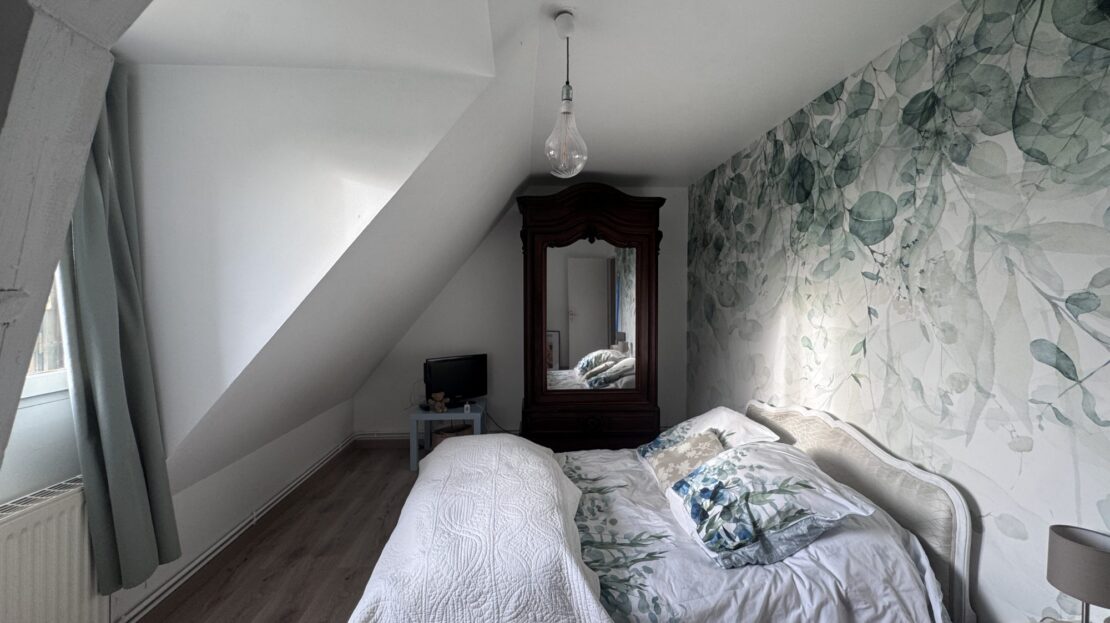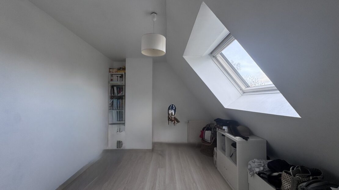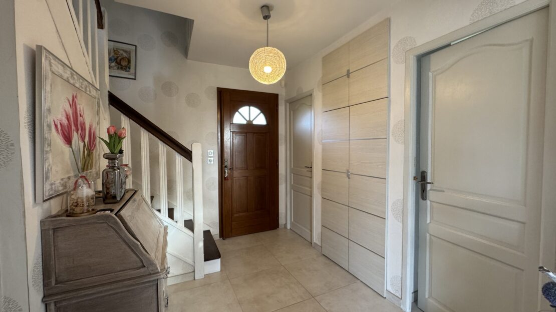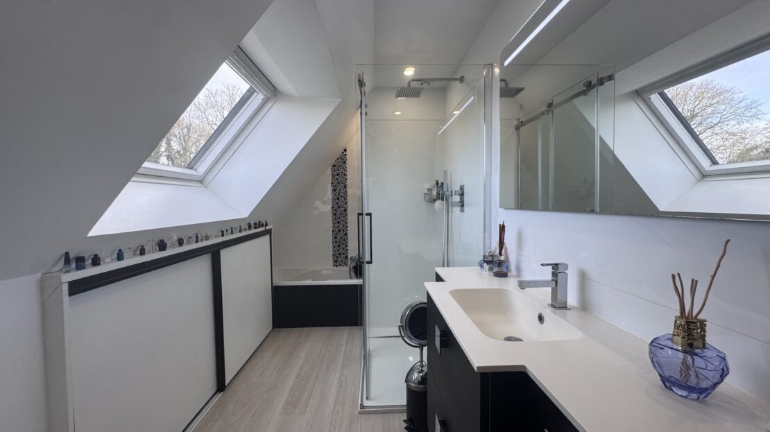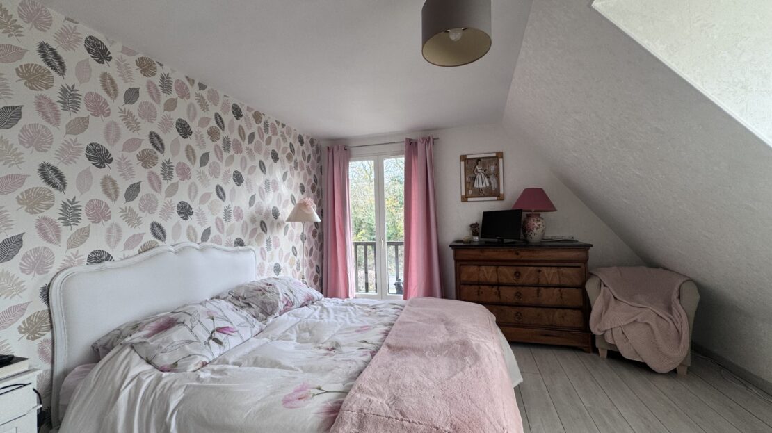 À l’étage, trois grandes chambres dont une avec balcon, ainsi qu’une salle de bains équipée d’une douche, d’une baignoire et d’un WC.