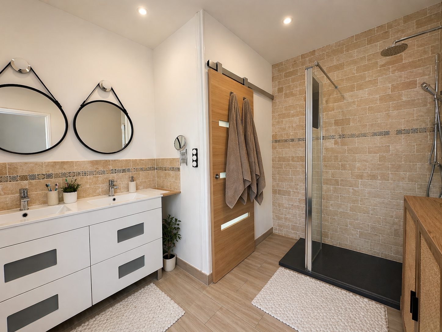 Entrée accueillante, cuisine aménagée et équipée, séjour lumineux, et salon cosy avec cheminée (parfait pour des soirées conviviales). Une salle d’eau avec espace buanderie et un WC indépendant complètent ce niveau.