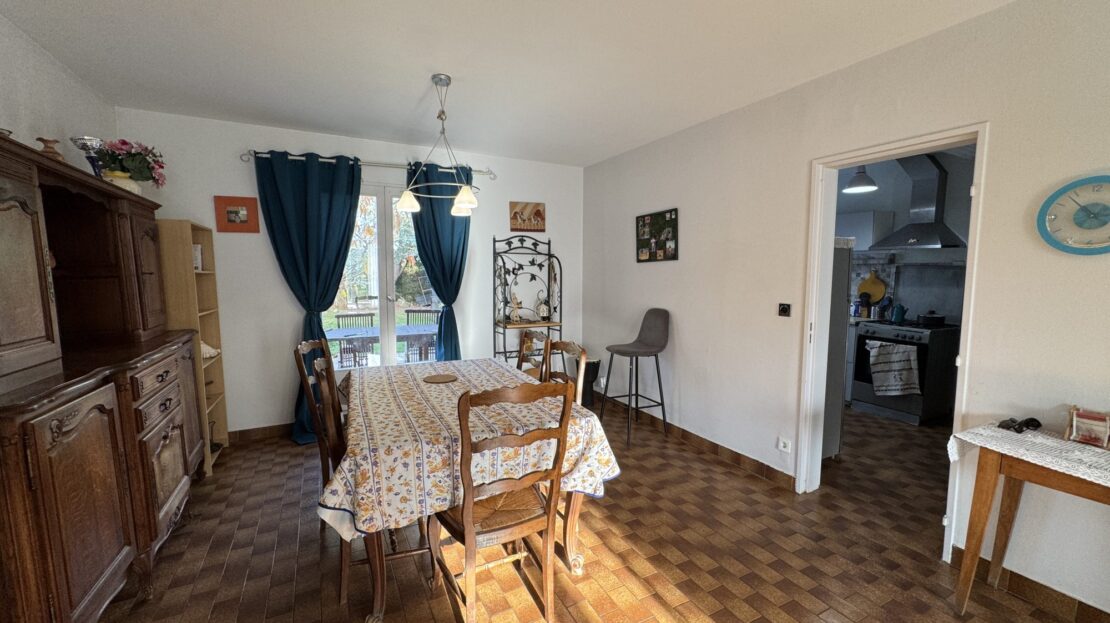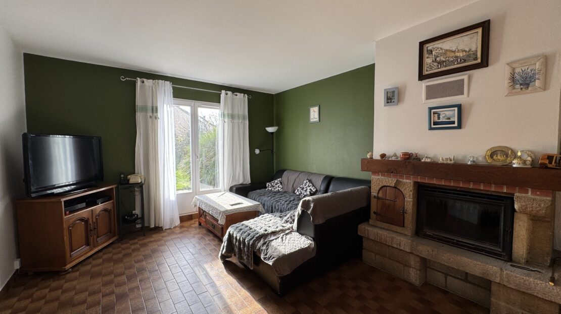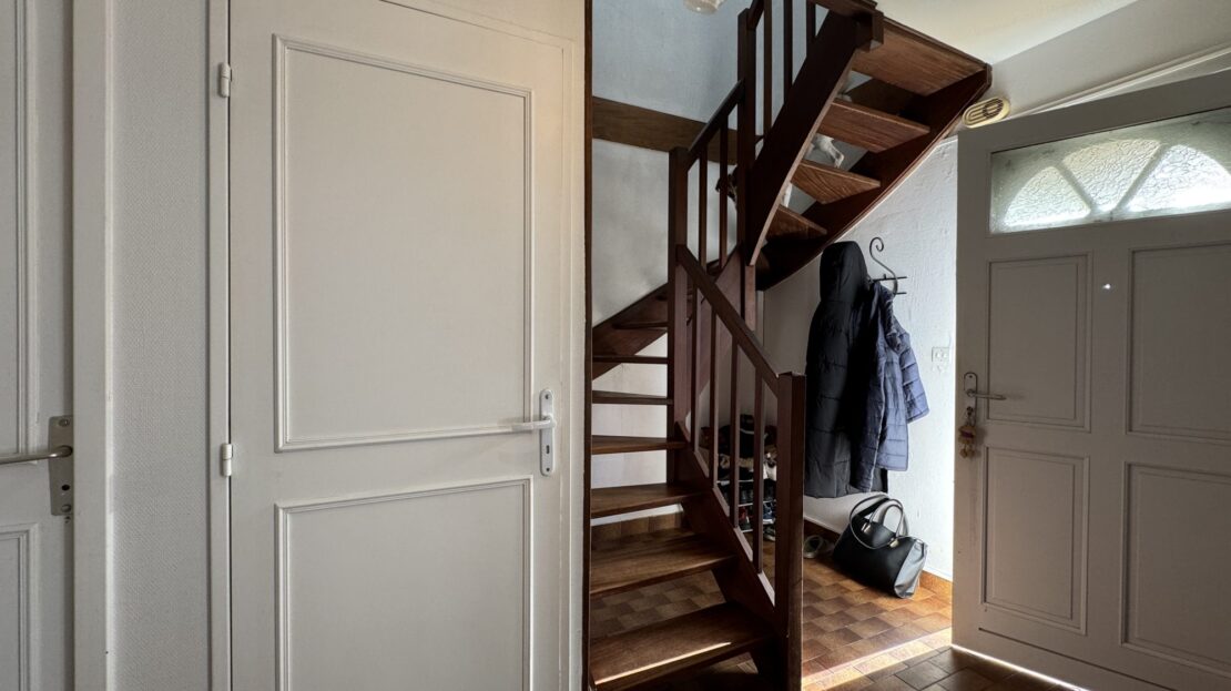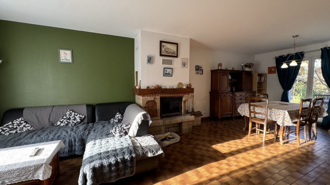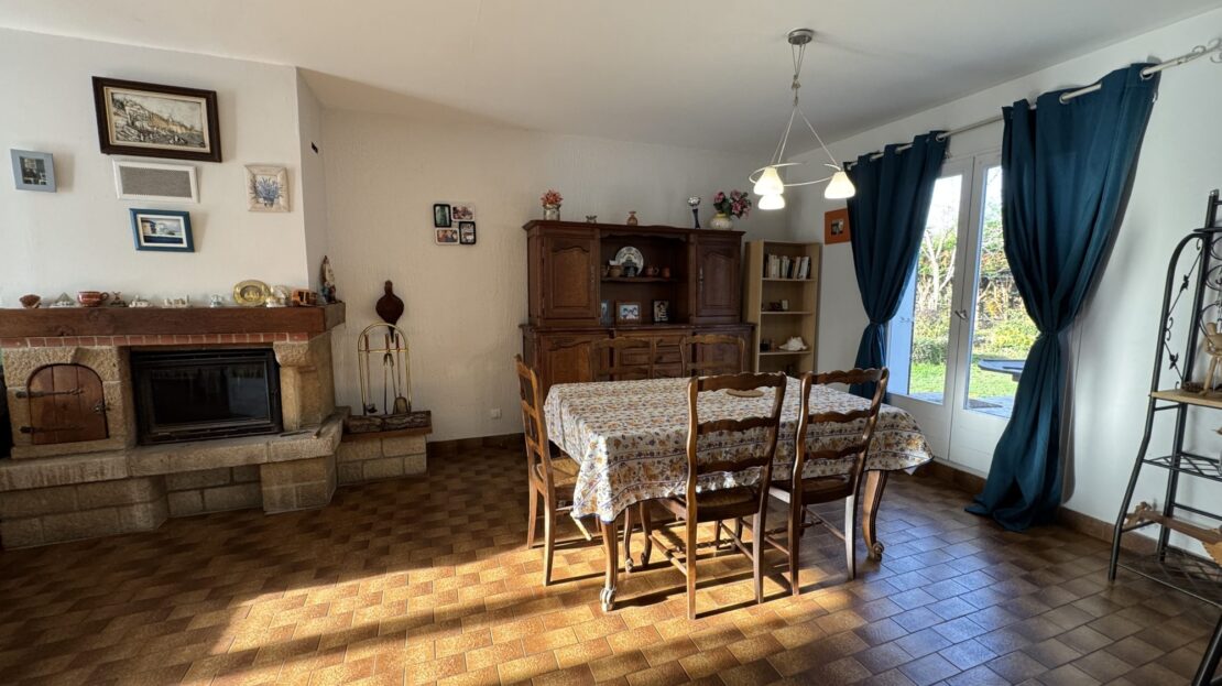 La maison se compose d’une entrée avec rangement, d’une belle pièce à vivre de 32 m² avec lumière traversante et cheminée avec insert, d’une cuisine avec cellier et accès au garage, ainsi que de WC indépendant.À l’étage, le couloir dessert trois chambres, une salle de bains et une salle d’eau avec WC.