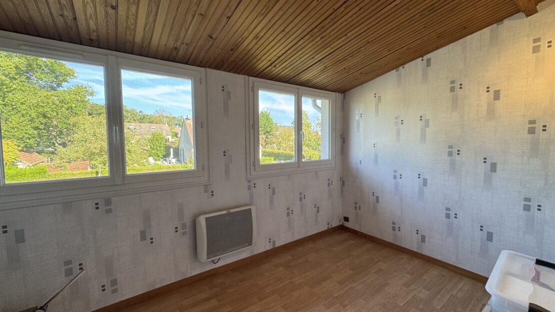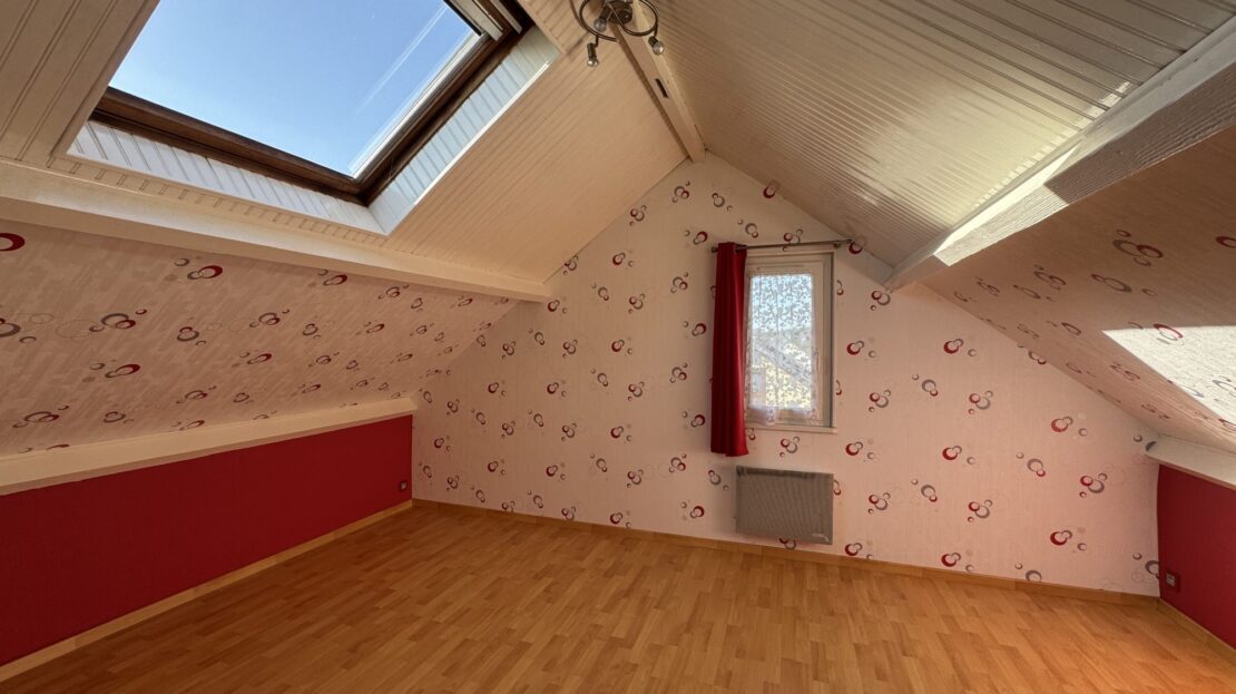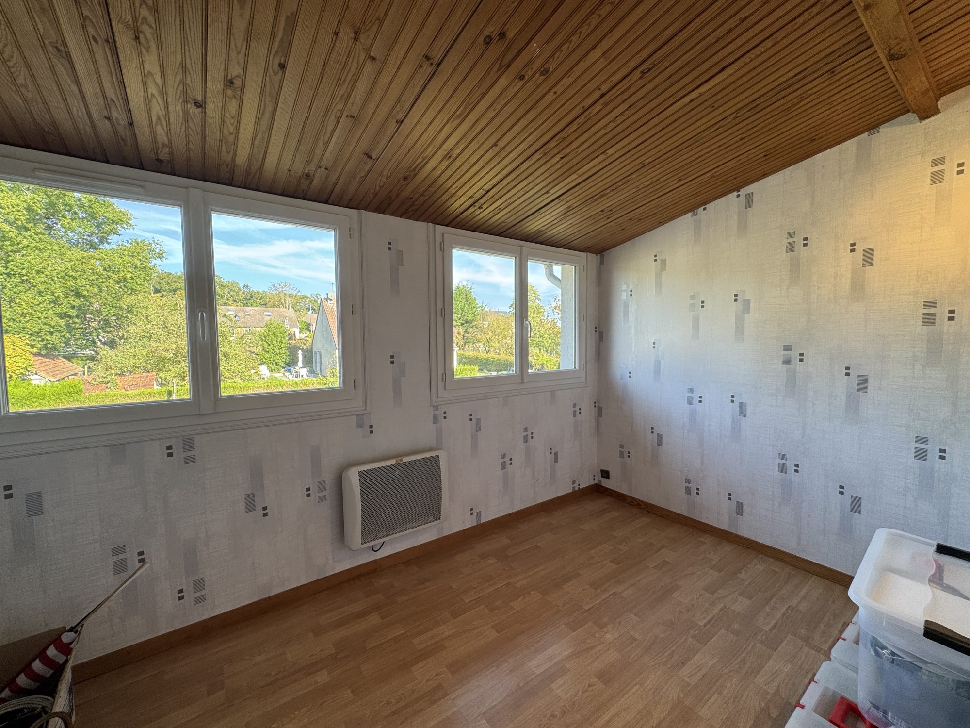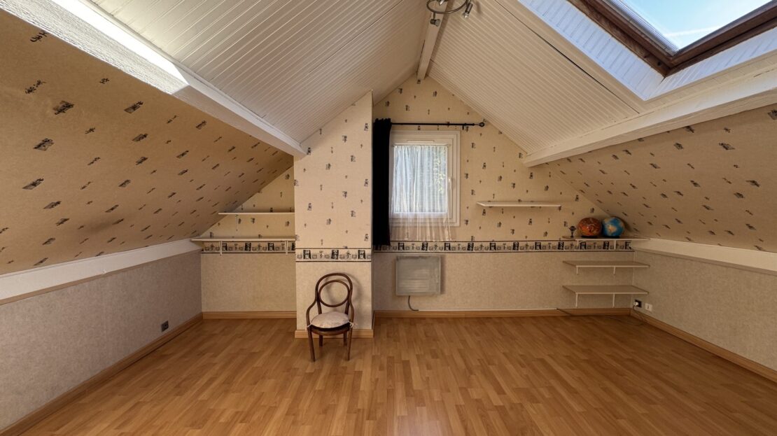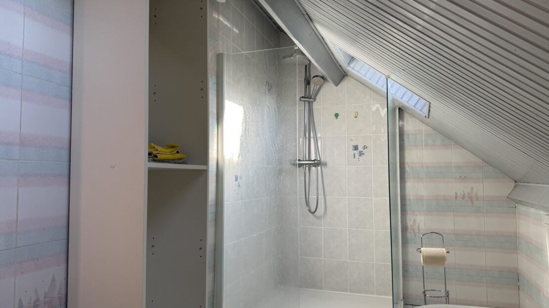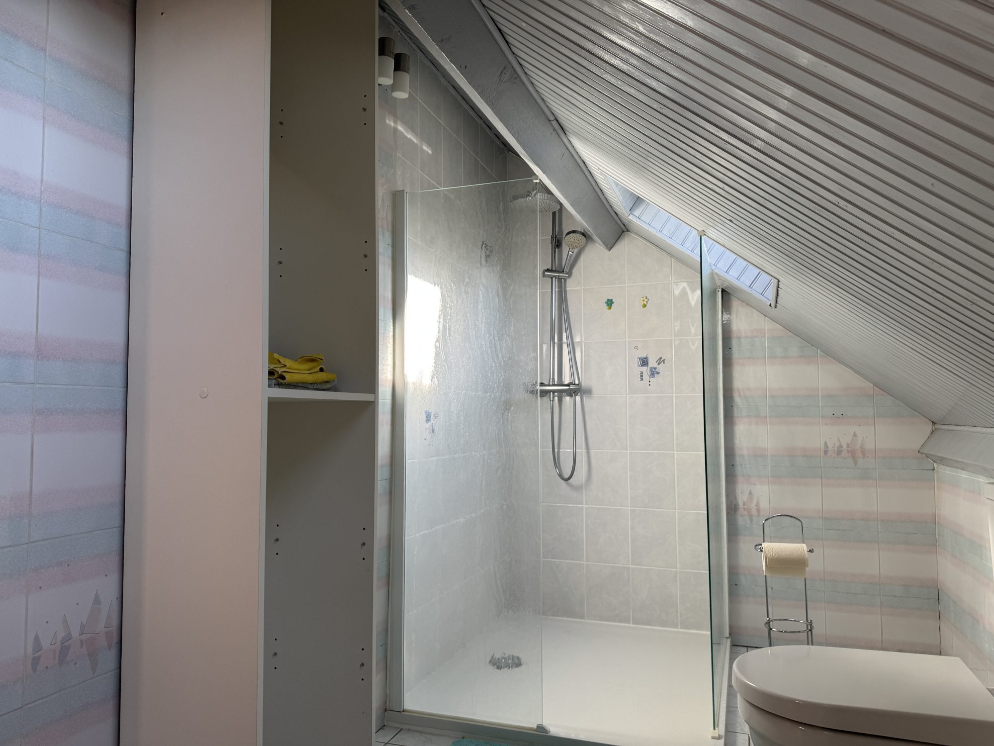 A l’étage : couloir desservant trois chambres et salle de douche avec WC.