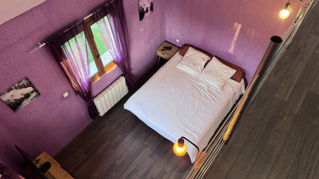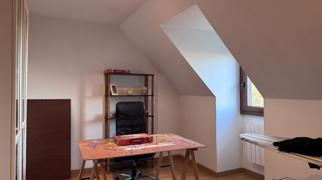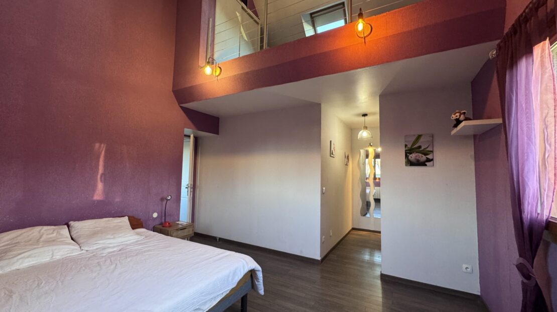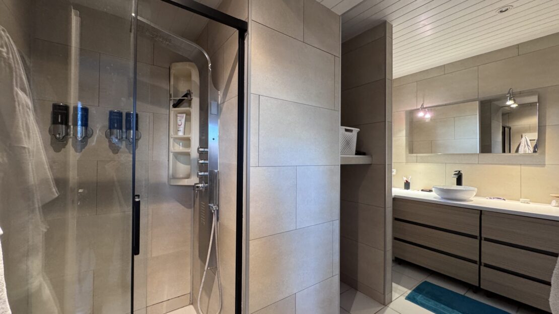 Au rez-de-chaussée, un grand hall d’entrée avec dressing desservant une pièce de vie avec poêle à bois ainsi qu’une cuisine entièrement équipée ouverte. On y retrouve également un espace parental composé d’une chambre, d’un dressing et d’une mezzanine à usage de bureau. Une salle de douche et WC indépendant.
