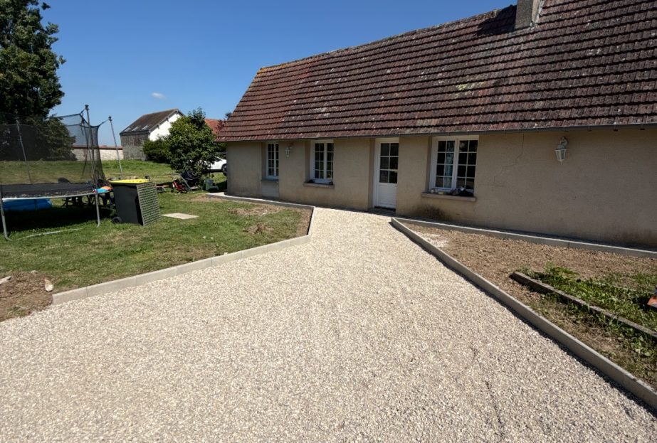QUATREMARE, maison de plain pied avec un grand terrain de 2100 m2 avec un parking et allée gravillonnée :