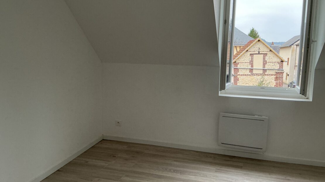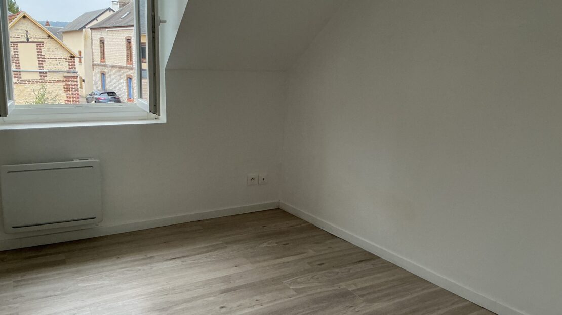 POSES, maison ancienne rénovée totalement en 2023 : entrée dans séjour ouvert sur cuisine aménagée, cellier, wc et salle de douche.