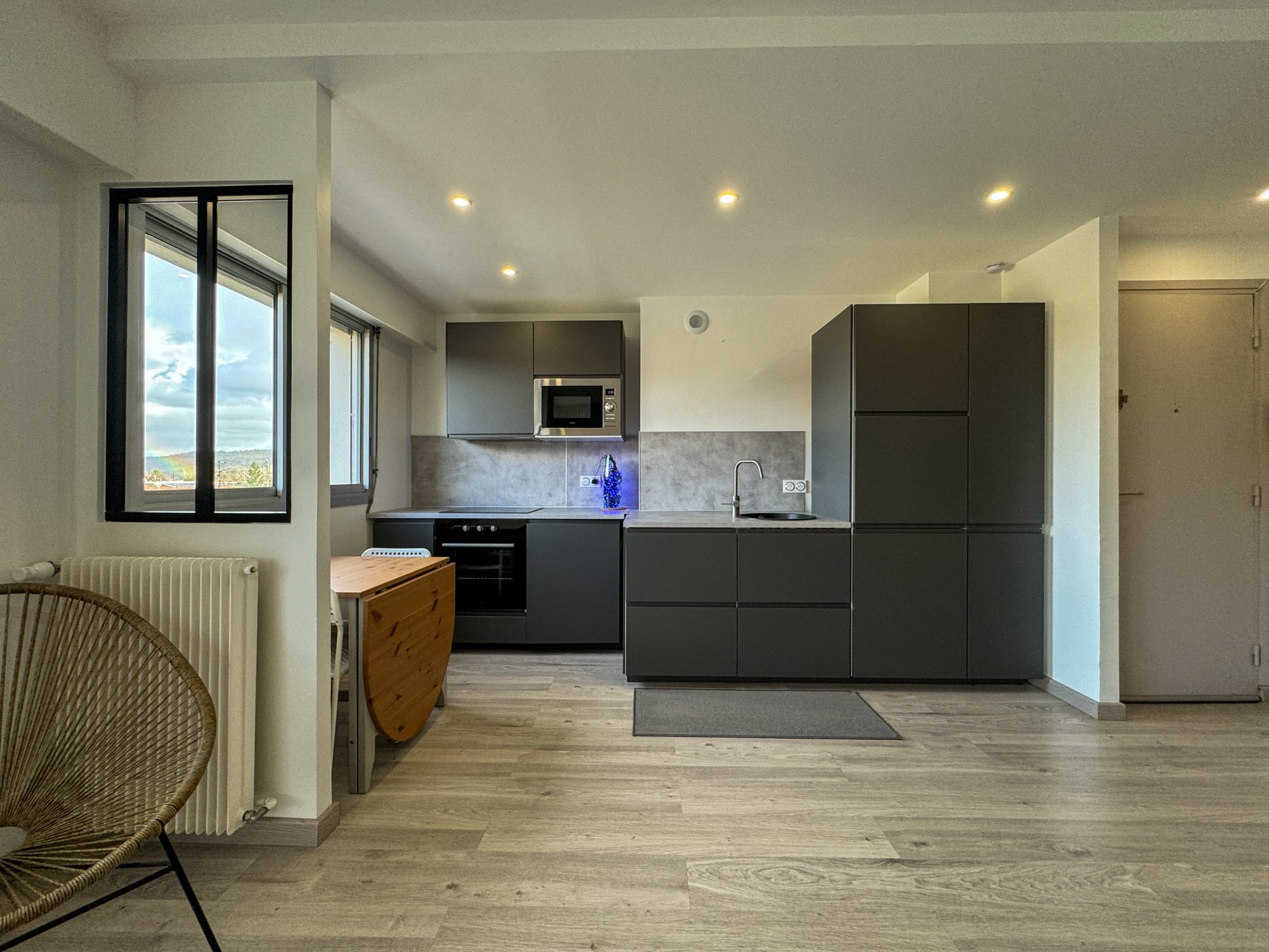 Une entrée avec grand placard desservant un pièce de vie avec cuisine entièrement équipée (four, plaque, hotte, four à micro-ondes, réfrigérateur) ouverte et une salle de bain avec WC.